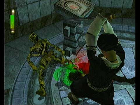 At roughly half mast on the sanity bar, Eternal Darkness will play a bit differently: the camera will slump to the side or pull an obscure angle, you’ll notice trickles of blood dripping down the walls or from the ceiling and your character will start to gibber phrases like, “This can’t be happening to me.” It would be an injustice to ruin too many of the effects that occur when your sanity bottoms out, but suffice it to say your character becomes harder to control, and the game will pull stunts on you occasionally. One memorable trick that caught me fully unprepared was the muting of the sound accompanied with a large, green block-lettered MUTE in the corner of my TV. One doesn’t usually expect a game to break the fourth wall in this way, so it can catch you totally off guard.