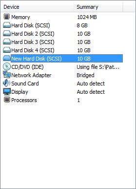 Ok, my data is safe for the time being, but with one disk down I don’t have any room for error. I’ll have to replace that hard disk with a new one. First thing I’ll have to do is shut the system down so that we can add the new disk. While I’m adding a disk in VMWare’s hardware interface, imagine yourself crawling under your desk with a screwdriver and an anti static strap.