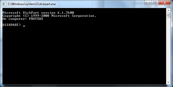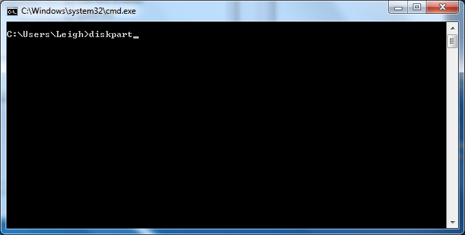 Accept the UAC which appears (if you haven’t already wound down the UAC settings so they don’t bug you) and you’ll be presented with the diskpart window.