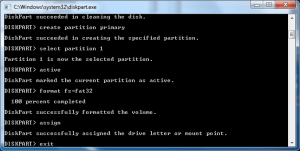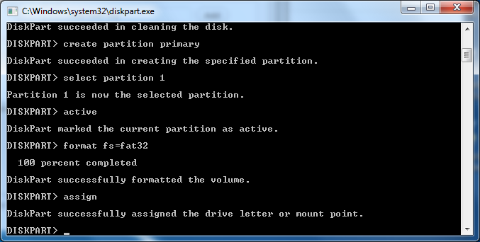 And go and make a cup of tea. The format will take a while to complete. The reason we’ve used diskpart is mainly because the standard format menu within windows explorer will only allow us to format the stick as either NTFS or exFAT – both are unacceptable for this exercise. When the format is complete, we’ll assign (get windows to assign the USB thumb drive a disk letter):