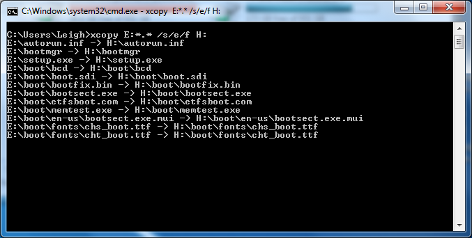 Now we’ll copy everything from our Windows DVD across to our USB thumb drive. Do this from a Windows command line as follows: