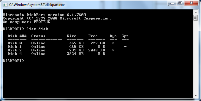 Now we’ll select the disk we’re going to run on. Type LIST DISK to list the disks which are currently connected to your system. Mine looks like this:
