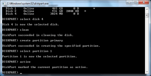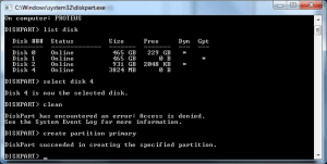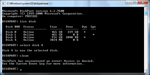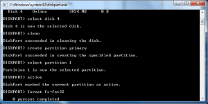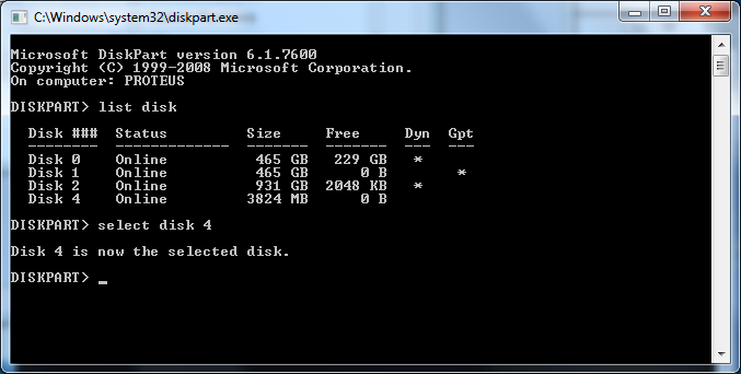 I can see that my 4Gb thumb drive is disk 4. I’ll type SELECT DISK 4.