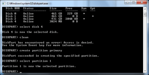 Now that we’re working on the disk we want to use, let’s blow away any existing partitions and start from scratch. We’ll use the clean command first. Ignore the error it gives – it’ll still destroy the partition whether it errors out or not.