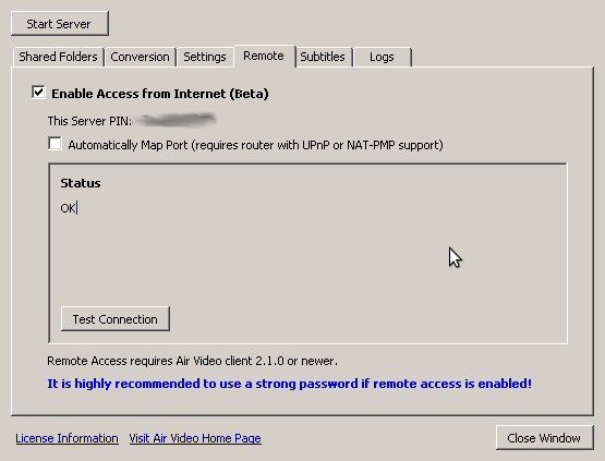 Next, jump to the remote tab to turn on remote support. This will register your AirVideo server on the InMethod server with a PIN which will allow your AirVideo to be accessed externally. This relies on uPNP to open up the port for you, but if it sits there thinking and doesn’t seem to be doing anything, you may need to uncheck “Automatically map port” and perform the port forwarding manually on your router. Make a note of the PIN which is assigned, as we’ll need it connect from your iDevice later.