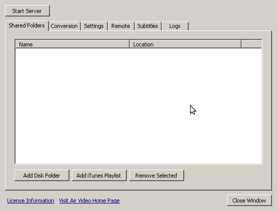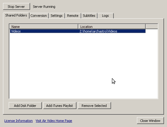 Note that at the moment there aren’t any folders shared, and the server isn’t running. We’ll add some folders by pressing the “Add Disk Folder” button and selecting which folders we want to share.