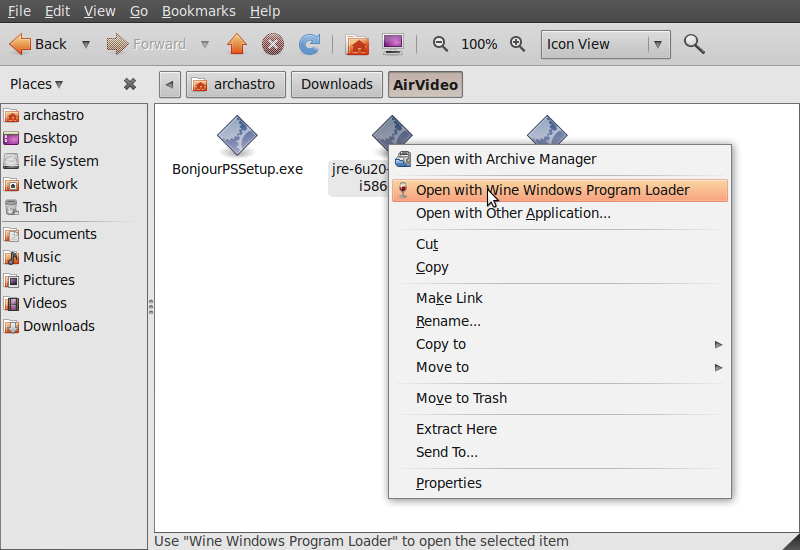 Now all you need to do to install these programs is to right click on them, select “Open with with Wine Windows Program Launcher” and complete the installation as you would on a windows machine. It’s best to do Java, then Bonjour, then AirVideo.