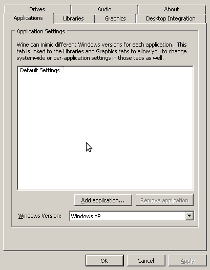 Once installed, start wine config for the first time. It is located under Applications > Wine > Configure Wine.