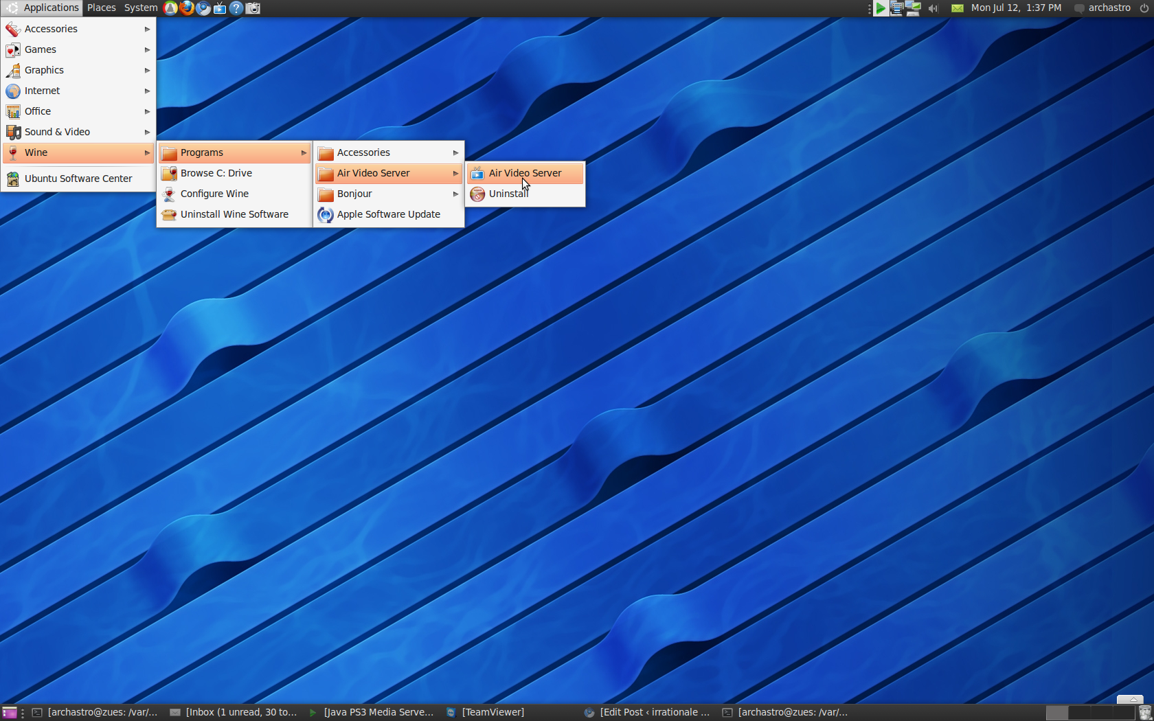 There is an unofficial Linux version, but it’s confusing enough for me, let alone those who aren’t massive nerds. Until there’s a simple installable binary package I’m not going to use the Linux version. I’ll use the Windows version, but run it in an enclosed Windows API environment called Wine. According to the AppDB at WineHQ, a community which tracks how well different Windows software runs within different versions of Wine, AirVideo has a Platinum rating – that it should run perfectly with little or no modification.
