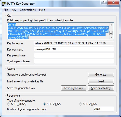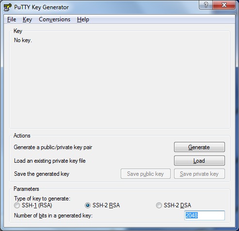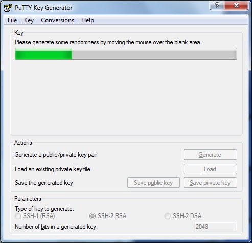 Launch PuTTYgen, Change the number of generated bits to 2048 and press Generate: