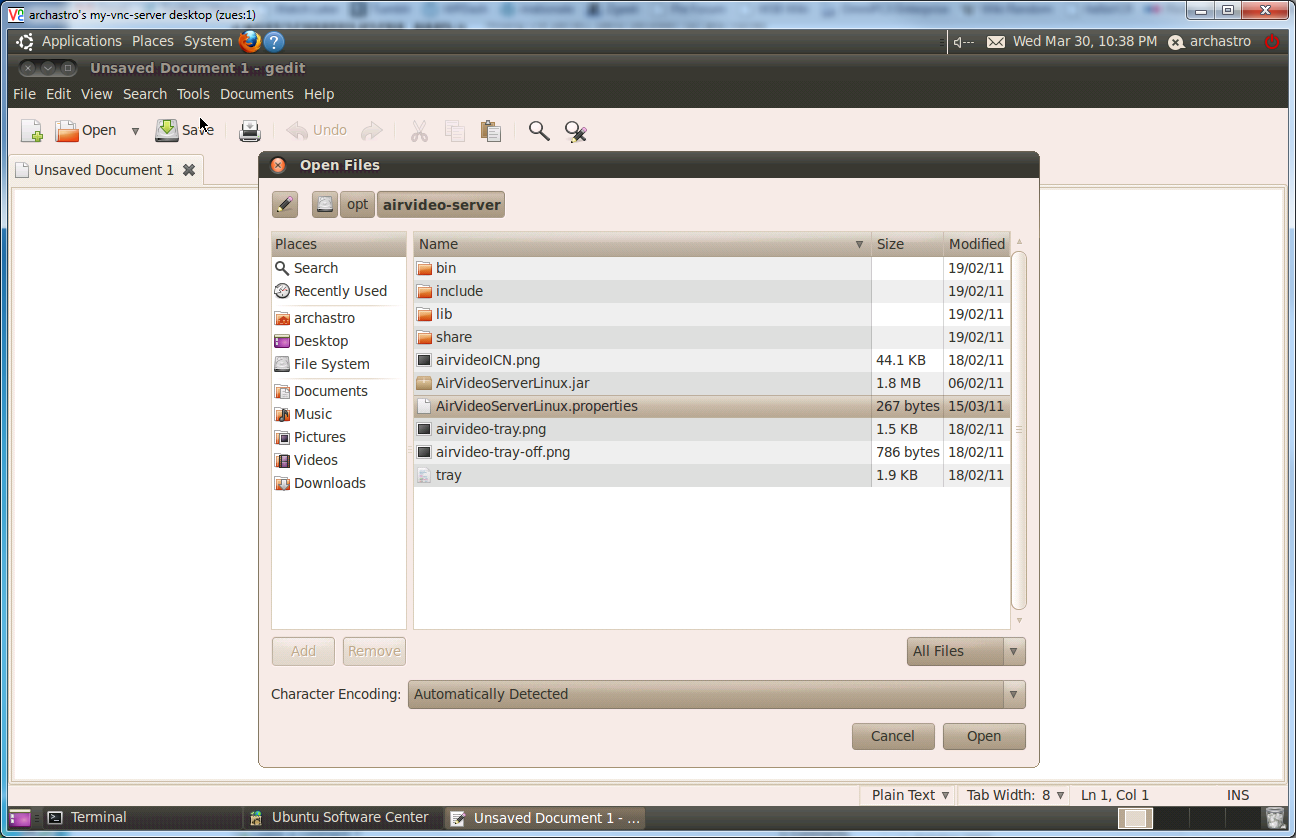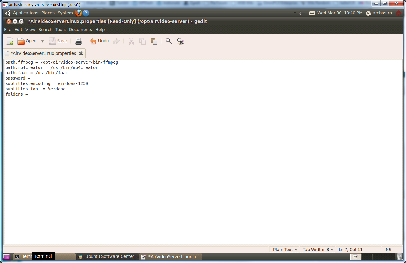 Press the Open button, and browse File System (in the left hand bar), opt, airvideo server. In this folder, you’ll find a file called AirVideoServerLinux.properties: