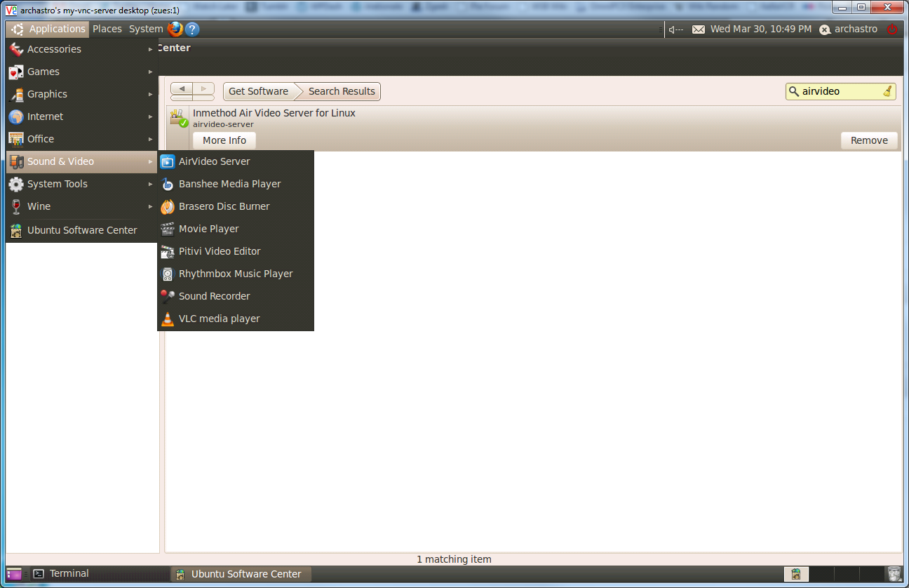 Press Save to commit your changes and you’ll be ready to fire up Airvideo. In the Applications menu, under Sound and Video, you’ll see a new program called AirVideo Server. Click it to start AirVideo.