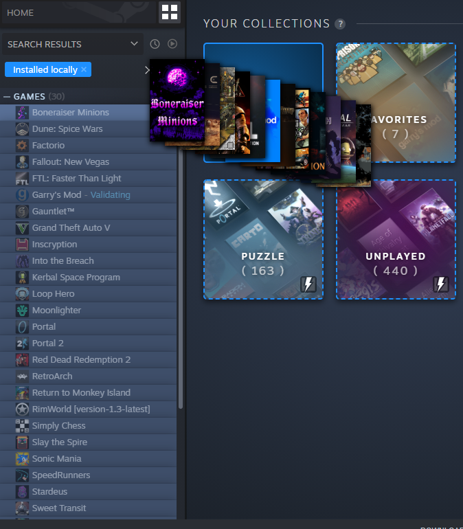 Before reinstalling or moving to a new computer, you first need to create a collection of the games you want to install next time. In your games list in Steam, click the Advanced Filters button and check Installed Locally.
