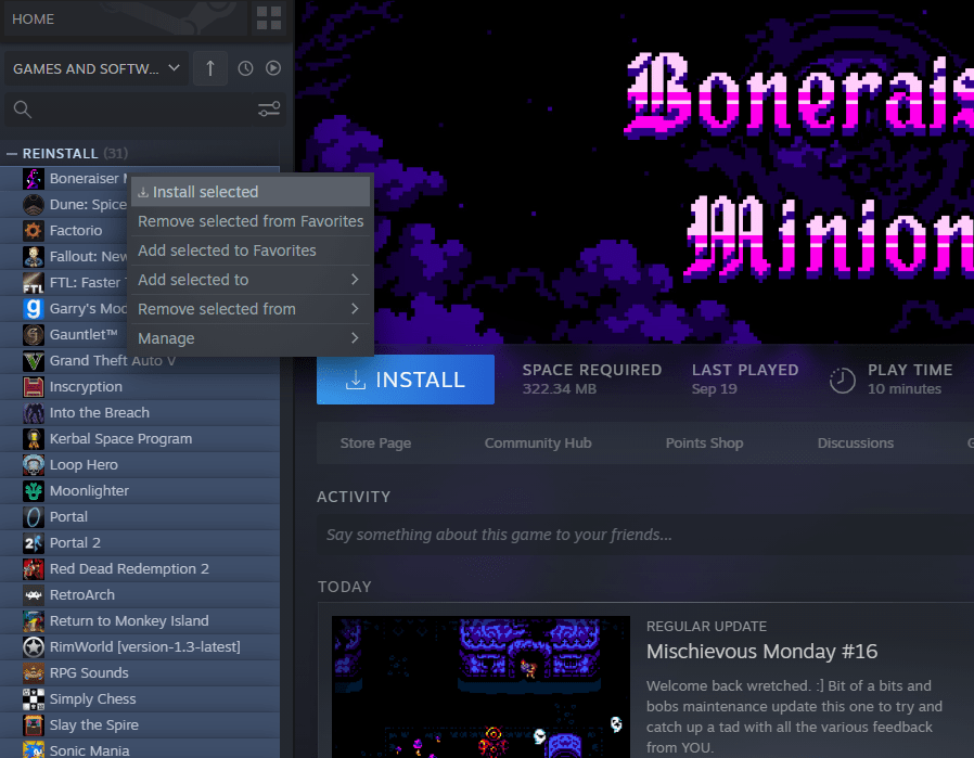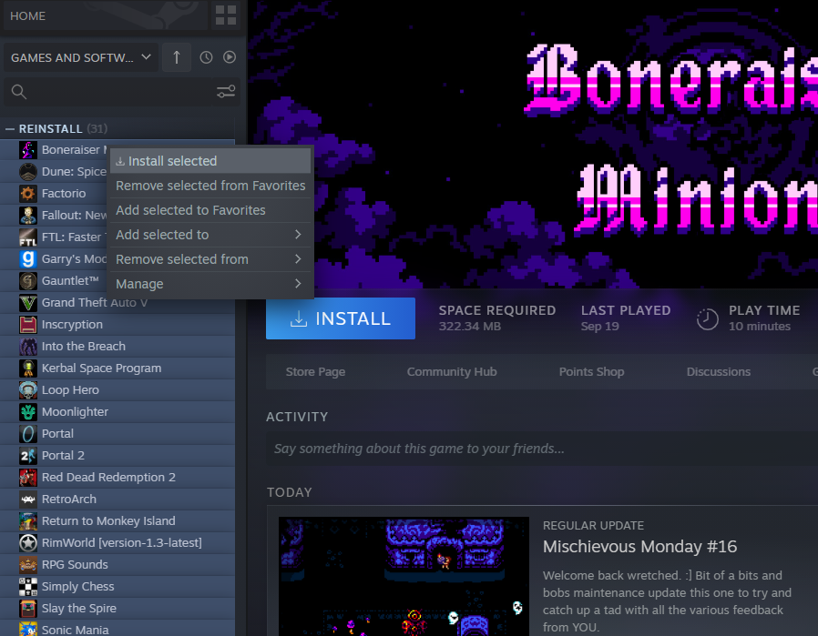 Log back into Steam, browse to Collections and find the one you created. Click the first game, hold shift and click the last to select all, then right click and select Install Selected.