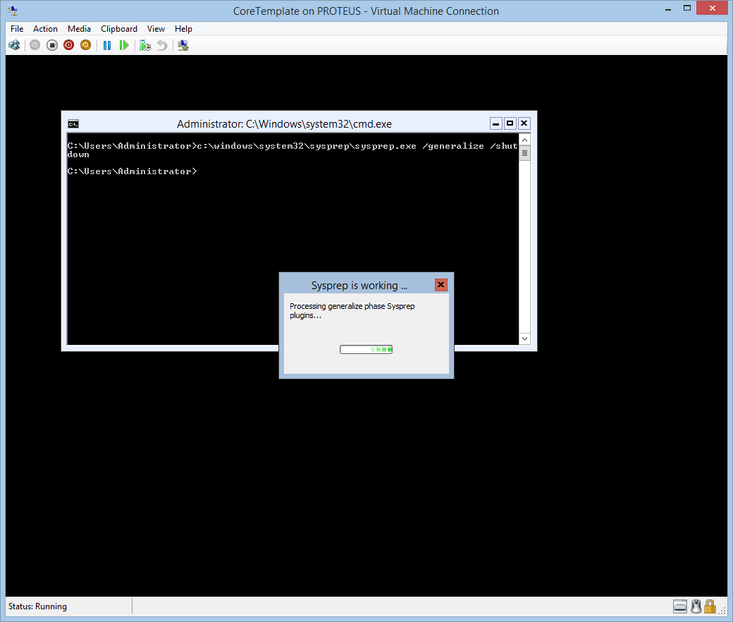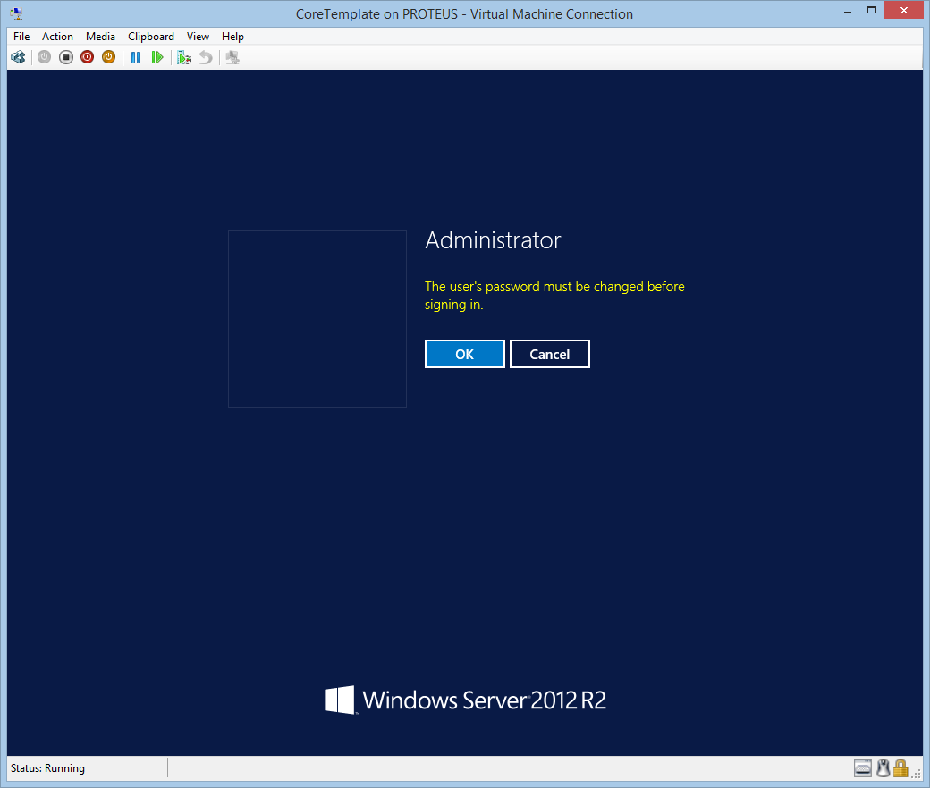 Well, it’s not technically a template, I suppose, but the first thing which is necessary in building a repeatable lab is creating a disk with Windows Server 2012R2 installed and sysprepped, which can then be used as the parent for differencing disks for all our other machines. If you were to just copy a virtual disk and try to create a new machine, you’d have troubles starting both the original machine and the cloned machine at the same time because their Security ID (SID) would be identical. Sysprepping allows a full reset of the SID so every new cloned disk (or differencing disk, in our case) will come up as a brand spanking new machine.