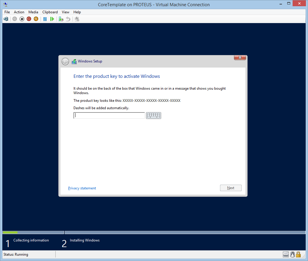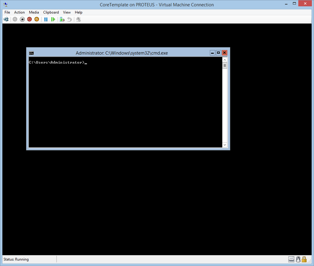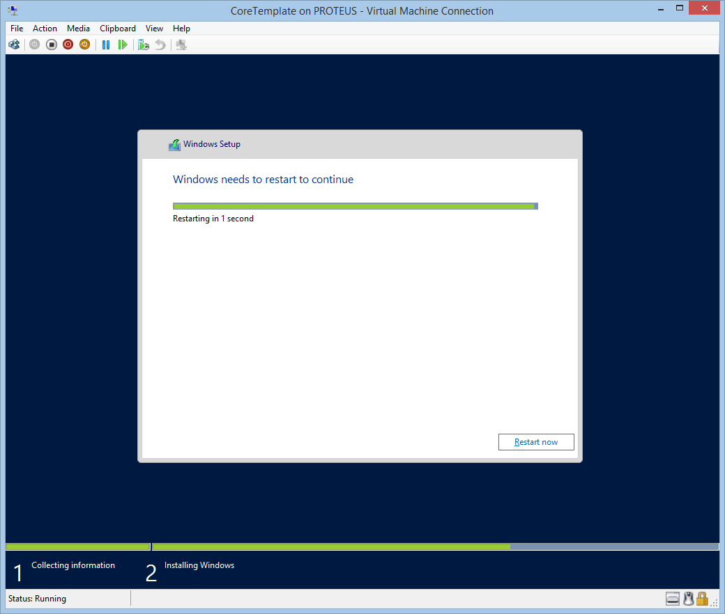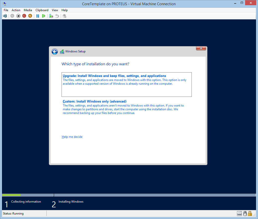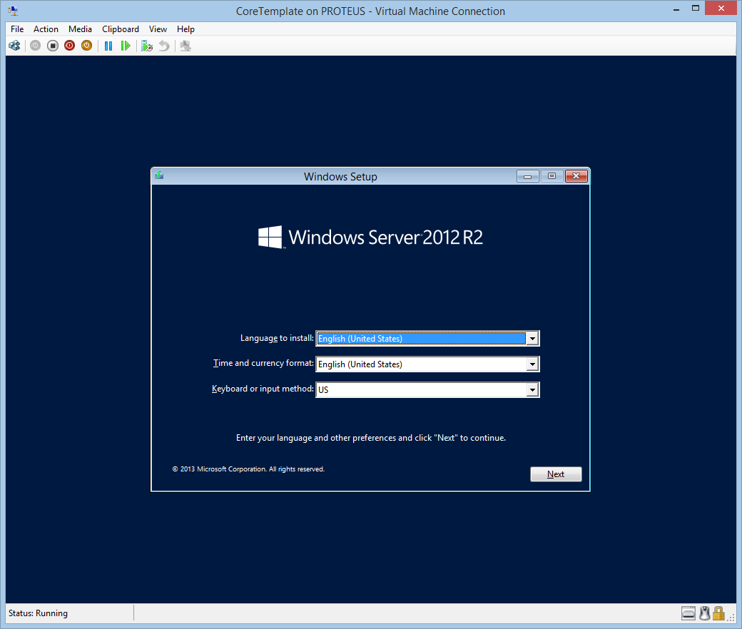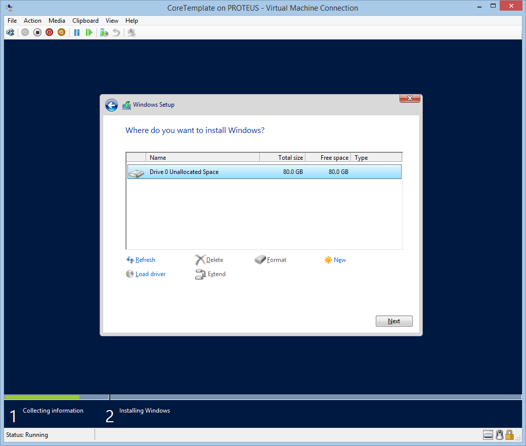 Once executed, a new machine will appear in Hyper-V manager called “CoreTemplate,” which has 512Mb of memory, an 80Gb dynamically expanding hard disk, has the Windows DVD mounted (and set as the boot device), and is connected to your internal network. It’ll then automatically start itself - double click on the machine in Hyper-V Manager to open a console and mash some keys to boot from the DVD.