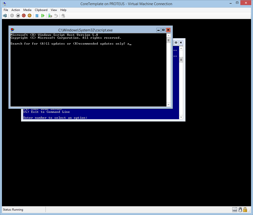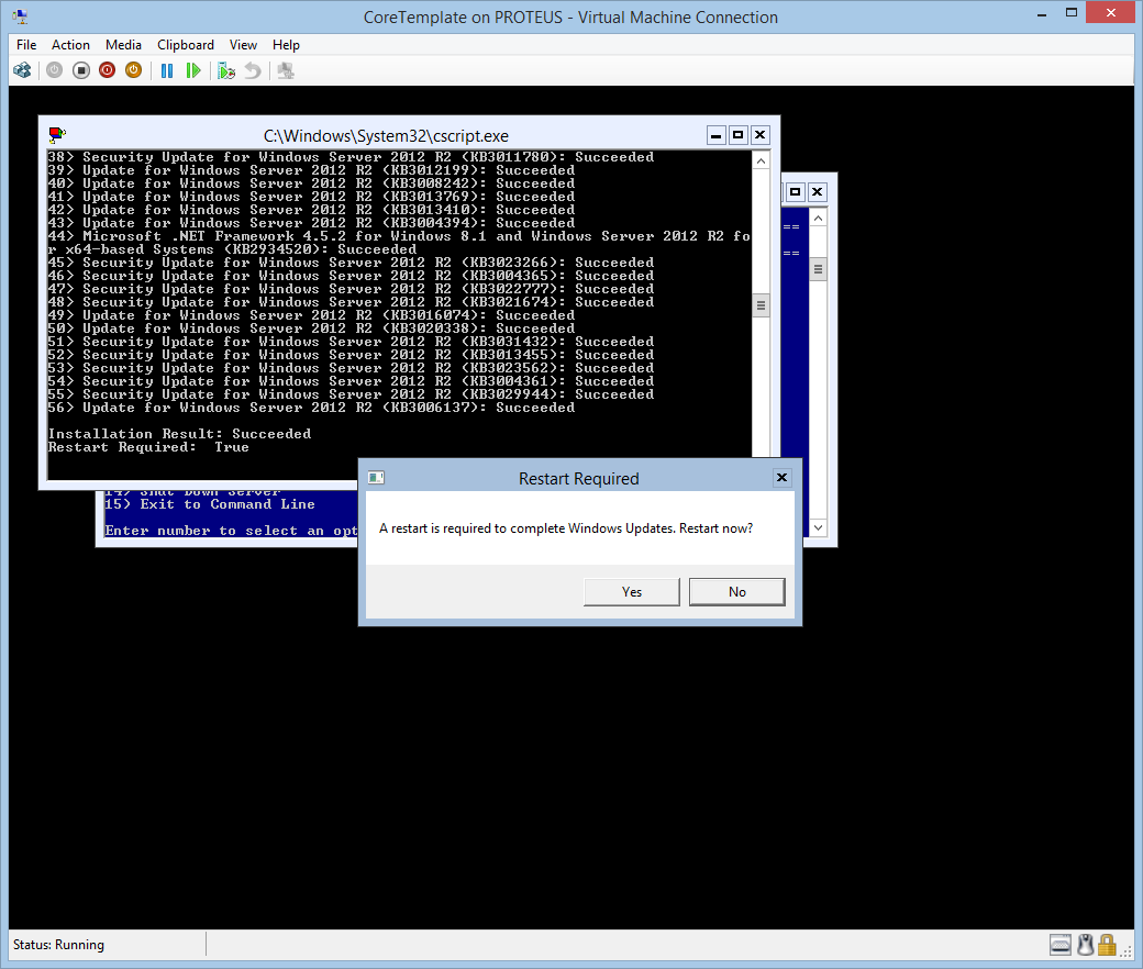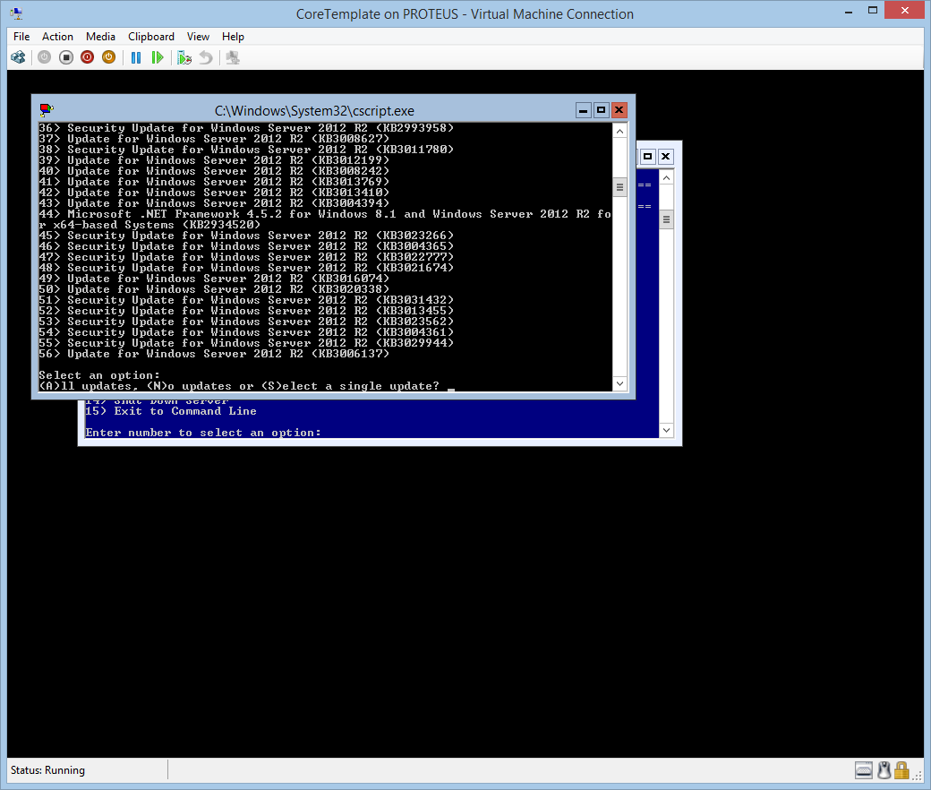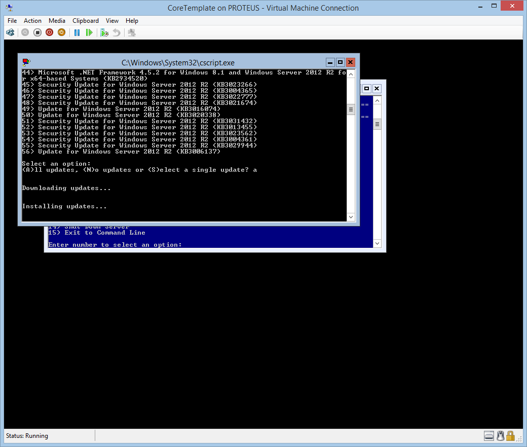 The first machine will be a Windows 2012 R2 Server Core install, which is as lean as you can get. We’ll also run a windows update from the comandline, and finally we’ll sysprep the machine in preparation for cloning.