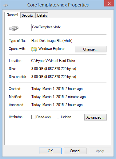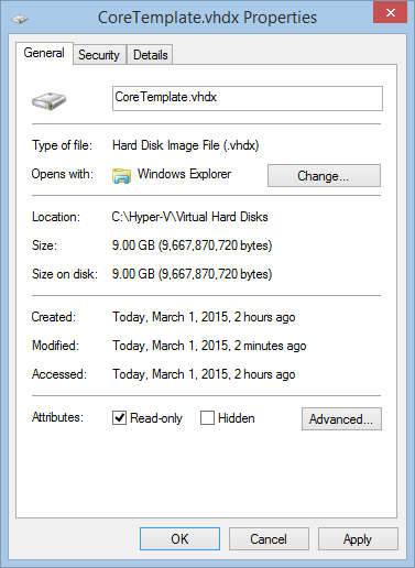In Windows Explorer, browse to the location where you stored the virtual hard disk file, for example C:Hyper-VVirtual Hard Disks, locate the disk we created during the installation, right click and select properties. We’re going to set this base disk as Read Only, as we don’t want any of the differencing disks down the line to make any changes to it, otherwise we’ll be in a world of hurt: